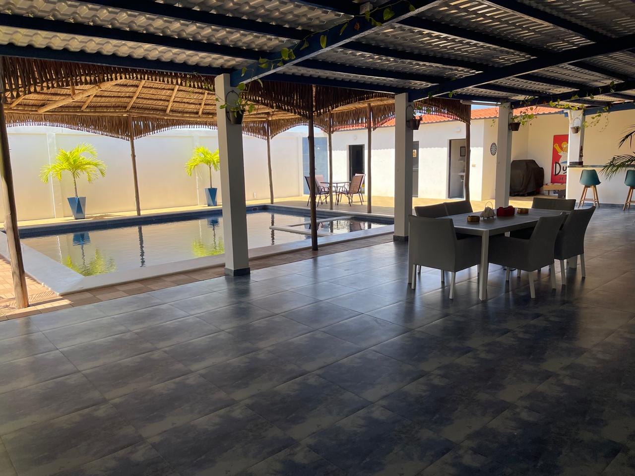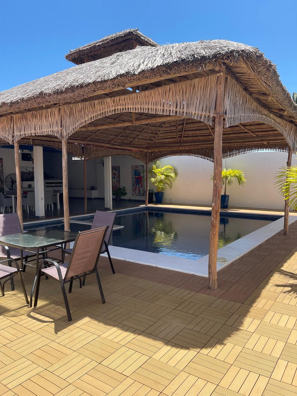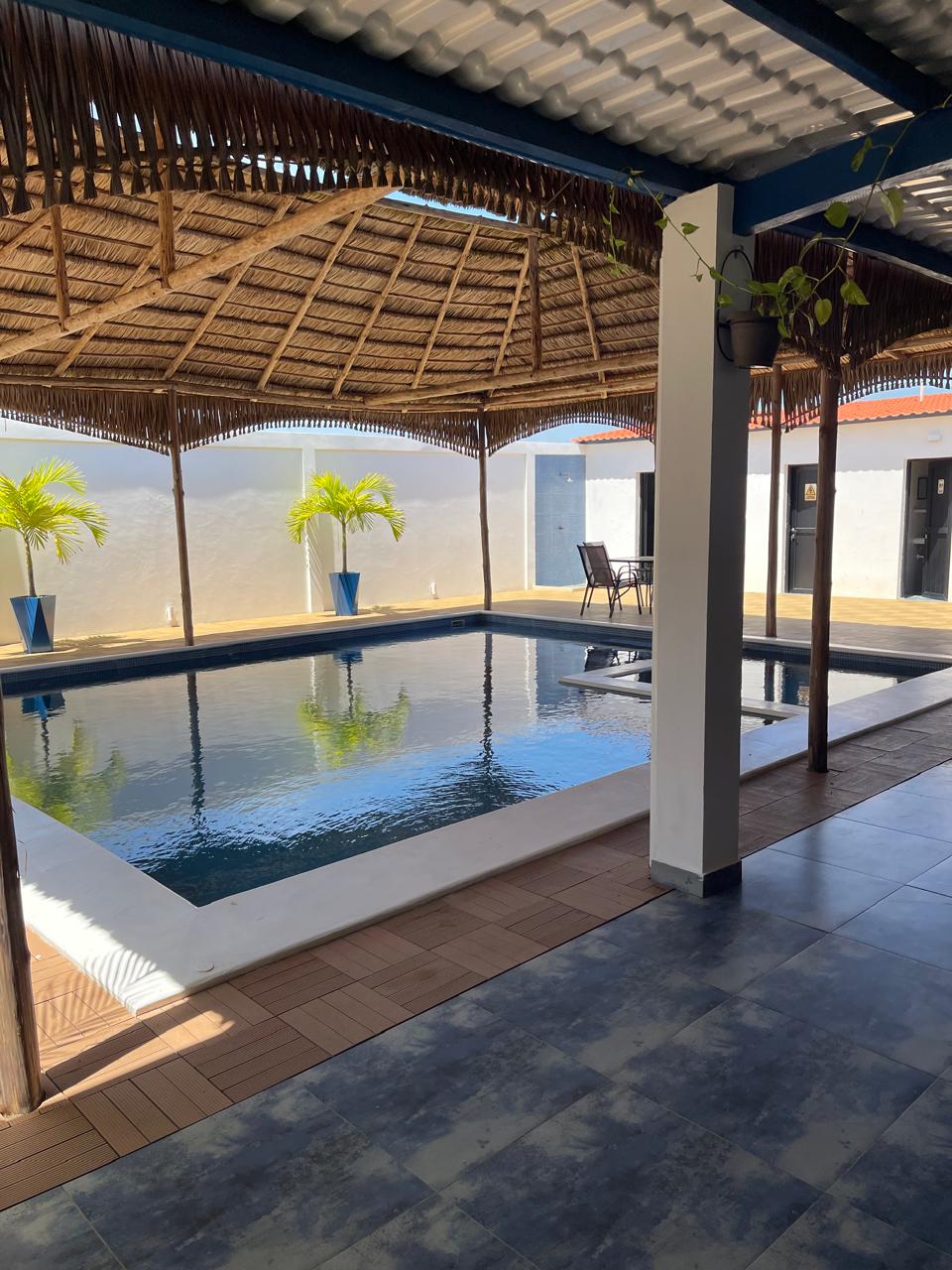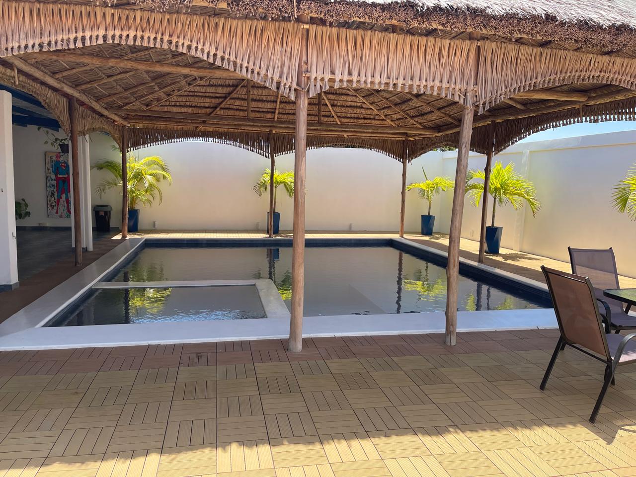 La casa cuenta con una piscina privada (9m × 6m), donde se puede disfrutar con música alegre debajo del bohío que cubre la piscina. Tiene 2 habitaciones, cada una equipada con aire acondicionado y baño privado con ducha y WC. Además, dispone de una terraza extragrande y un bohío para relajarse.